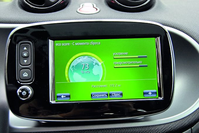 И, кстати, про игры. Экономичность всегда была у smart fortwo на особом счету, а теперь она обрела буквальную визуализацию. Ты едешь — и твои баллы за экологическую сознательность зачисляются. Я набрала 94 эко-балла, как сказали — рекорд, правда, так и не поняла: упали они мне на банковский счёт в виде бонуса к зарплате или просто отправились в штаб-квартиру Mercedes для отливания там именной доски в мою честь.